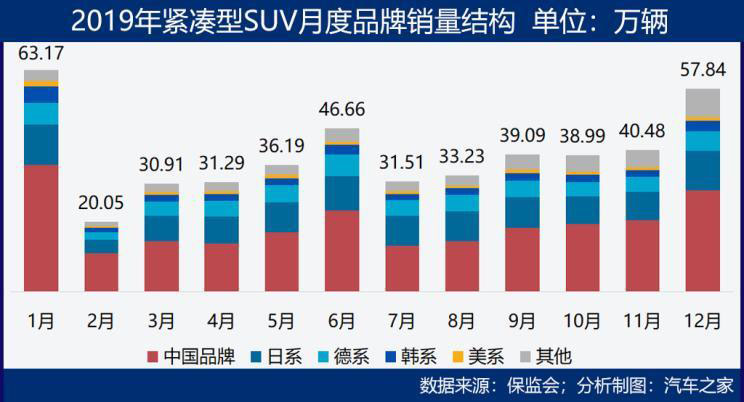 SUV市場(chǎng)的發(fā)掘者是中國(guó)品牌,但近幾年合資品牌開(kāi)始大步快跑進(jìn)入,對(duì)中國(guó)品牌的先發(fā)優(yōu)勢(shì)形成了較大的沖擊。從市場(chǎng)份額看,2019年還是中國(guó)品牌銷(xiāo)量最高,406.3萬(wàn)輛的銷(xiāo)量市場(chǎng)份額43%,日系SUV全年銷(xiāo)售374.1萬(wàn)輛占比21%,德系銷(xiāo)售288.4萬(wàn)輛占比18%。