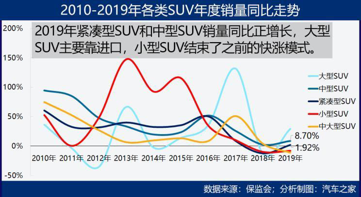 2019年國(guó)內(nèi)SUV總銷(xiāo)量952萬(wàn)輛,同比增長(zhǎng)0.64%,供需熱度依然不減。其中以中型SUV的增幅為最大,有8.7%,主要受德系車(chē)型拉動(dòng)。緊湊型SUV增長(zhǎng)了1.92%,中國(guó)品牌的長(zhǎng)安CS75和哈弗M6都有可觀(guān)的增幅。小型SUV的銷(xiāo)量則減少7.9%,銷(xiāo)量最高的寶駿510“受傷”較重。中大型SUV減少11.2%,完全依靠進(jìn)口的大型SUV銷(xiāo)量大幅增長(zhǎng)29.5%,主要車(chē)型是途樂(lè)、奔馳GLS、雷克薩斯LX和寶馬X7。