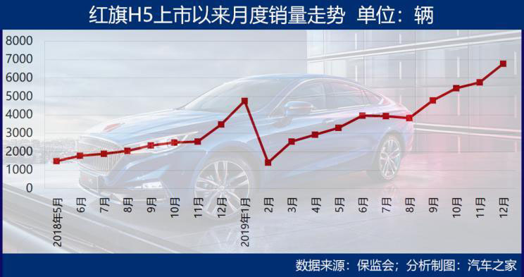 盡管上升不易,但2019年算是中國(guó)品牌中型乃至中大型轎車(chē)的發(fā)力之年,以紅旗品牌系列車(chē)型進(jìn)軍高端市場(chǎng)為代表。紅旗H5于2018年5月上市,上市以來(lái)累計(jì)銷(xiāo)量67542輛,2019年走出了一路向上的銷(xiāo)售曲線(xiàn),12月單月實(shí)現(xiàn)銷(xiāo)量6773輛,排在當(dāng)月中型轎車(chē)銷(xiāo)量第12位。
