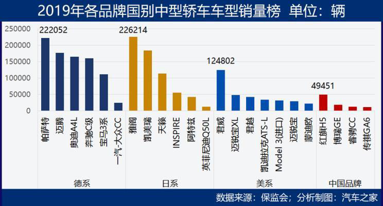 中型轎車(chē)在轎車(chē)市場(chǎng)的占比有21%,2019年累計(jì)銷(xiāo)量226萬(wàn)輛,德系一家獨(dú)大,以93萬(wàn)輛的年銷(xiāo)量占到41%的份額,同比增長(zhǎng)3.3%;日系年銷(xiāo)量66萬(wàn)輛,同比增長(zhǎng)5.2%,市場(chǎng)份額29%,中國(guó)品牌僅占4.6%,較2018年下滑0.6個(gè)百分點(diǎn),全年銷(xiāo)售10.4萬(wàn)輛,同比減少13.5%。