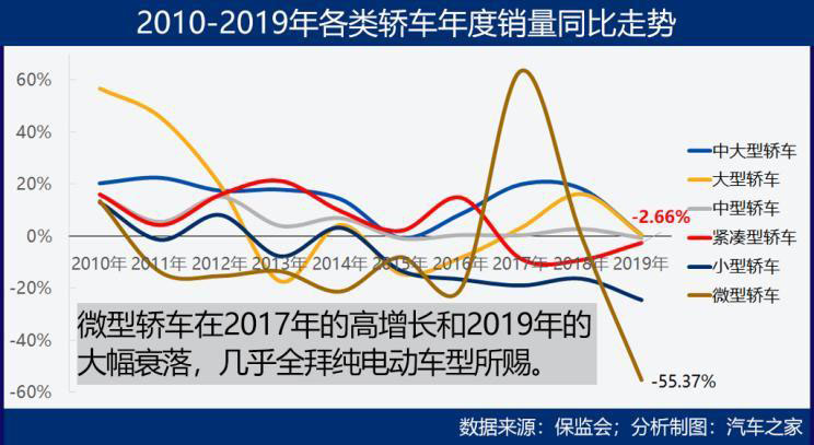 品牌割據(jù)方面,以5.59%的年度同比降幅為基準(zhǔn),2019年德系和日系轎車(chē)銷(xiāo)量跑贏(yíng)整體板塊市場(chǎng),尤其是日系轎車(chē),同比正增長(zhǎng)5.69%。中國(guó)品牌與德系和日系的差距在下半年拉大,造成拖累的是小型轎車(chē)和微型轎車(chē)板塊,再準(zhǔn)確地說(shuō),是這兩類(lèi)車(chē)的新能源車(chē)型在下半年的銷(xiāo)售不力所致。