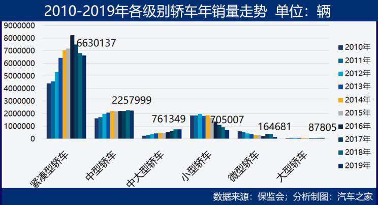 轎車(chē)占到國(guó)內(nèi)乘用車(chē)總體市場(chǎng)的一半,2019年銷(xiāo)售1061萬(wàn)輛,同比減少5.59%,比整體車(chē)市跌的厲害一些,其中緊湊型轎車(chē)占到62%。如果看一下十年走勢(shì),會(huì)發(fā)現(xiàn)一個(gè)非常明顯的趨勢(shì)是:緊湊型轎車(chē)的銷(xiāo)量從2017年開(kāi)始逐年減少,小型轎車(chē)銷(xiāo)量的衰減在2014年就開(kāi)始了,而中型轎車(chē)和中大型轎車(chē)的銷(xiāo)量卻在持續(xù)增加,中大型轎車(chē)是2019年轎車(chē)市場(chǎng)上唯一正增長(zhǎng)的車(chē)型品類(lèi)。隨著消費(fèi)結(jié)構(gòu)的升級(jí),轎車(chē)市場(chǎng)競(jìng)爭(zhēng)的高級(jí)化趨勢(shì)開(kāi)始顯現(xiàn)。