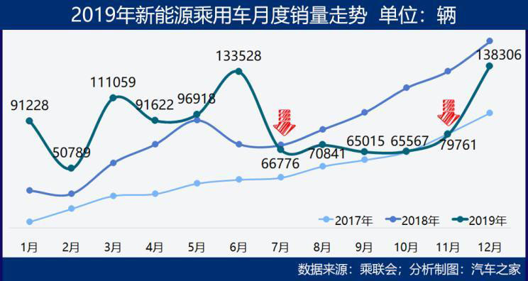 新能源汽車(chē)業(yè)結(jié)束了此前高歌上揚(yáng)的發(fā)展局面,2019年新能源汽車(chē)全年批發(fā)銷(xiāo)售106.4萬(wàn)輛,較2018年僅增長(zhǎng)4.64%。7月份,新的補(bǔ)貼周期開(kāi)啟,當(dāng)月銷(xiāo)量首次同比下滑,打破新能源車(chē)月銷(xiāo)量多年保持連續(xù)同比增長(zhǎng)的神話(huà);之后四個(gè)月持續(xù)不振,11月份,銷(xiāo)量下行擊穿2017年11月的水平(80767輛),但12月的收官,終于為2019年挽回了一些顏面,達(dá)成了年銷(xiāo)百萬(wàn)的水平。但新能源車(chē)市整體進(jìn)入低速增長(zhǎng)期已是事實(shí),2020年新能源板塊將承受比燃油車(chē)更大的需求壓力。