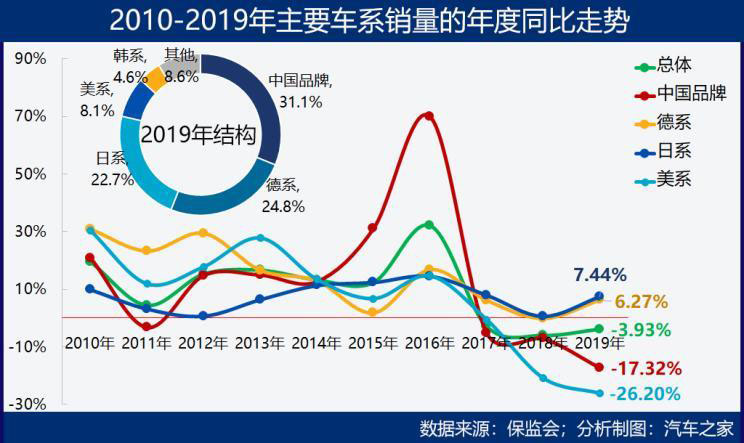 2019年,中國(guó)品牌汽車(chē)?yán)塾?jì)銷(xiāo)售675萬(wàn)輛,德系車(chē)銷(xiāo)售537萬(wàn)輛,日系車(chē)銷(xiāo)售492萬(wàn)輛,美系車(chē)176萬(wàn)輛,韓系車(chē)100萬(wàn)輛。走勢(shì)看,中國(guó)品牌銷(xiāo)量較2018年減少17.32%,是近十年來(lái)的最大跌幅;美系車(chē)則自2016年開(kāi)始在中國(guó)市場(chǎng)節(jié)節(jié)敗退,2019年的銷(xiāo)量跌幅進(jìn)一步加深,達(dá)26.2%。唯有日系車(chē)和德系車(chē),在2019年逆勢(shì)而動(dòng),銷(xiāo)量分別同比增長(zhǎng)7.44%和6.27%。