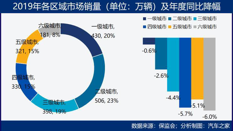 相對(duì)而言,一二級(jí)城市的首次汽車(chē)消費(fèi)達(dá)成比例已經(jīng)比較高了,未來(lái)增長(zhǎng)將主要來(lái)自增購(gòu)和換購(gòu)。2019年,一級(jí)城市的汽車(chē)銷(xiāo)量同比降幅只有0.6%,是所有區(qū)域中降幅最低的,二級(jí)城市汽車(chē)銷(xiāo)量同比減少2.6%,也低于整體汽車(chē)市場(chǎng)的跌幅,揭示了經(jīng)濟(jì)水平與消費(fèi)水平的正相關(guān)。而三、四、五、六級(jí)城市的降幅都較整體市場(chǎng)為深,這類(lèi)城市的汽車(chē)市場(chǎng)增長(zhǎng)潛力主要來(lái)自首次新車(chē)購(gòu)買(mǎi),去年國(guó)家啟動(dòng)了“汽車(chē)下鄉(xiāng)”等激勵(lì)措施,從目前結(jié)果看,增量效應(yīng)并不明顯。