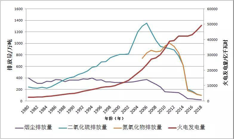 煤電煙塵排放量由1978年約600萬噸,降至2018年的21萬噸左右,下降超過96%;二氧化硫排放量由2006年峰值1350萬噸,降至2018年的99萬噸左右,比峰值下降約93%;氮氧化物排放量由2011年峰值1000萬噸左右,降至2018年的96萬噸左右,比峰值下降約90%。2018年與1978年相比,污染排放強(qiáng)度即單位發(fā)電量煤電煙塵(顆粒物)、二氧化硫、氮氧化物排放量,分別由約26、10、3.6克/千瓦時(shí),下降到0.04、0.20和0.19克/千瓦時(shí),這一水平達(dá)到世界領(lǐng)先水平。由1圖可以看出,隨著火電發(fā)電量的增長(zhǎng),污染物排放量呈現(xiàn)先升后降,并在近10多年來加快下降,表明了我國(guó)污染控制技術(shù)的不斷進(jìn)步和力度不斷強(qiáng)化。