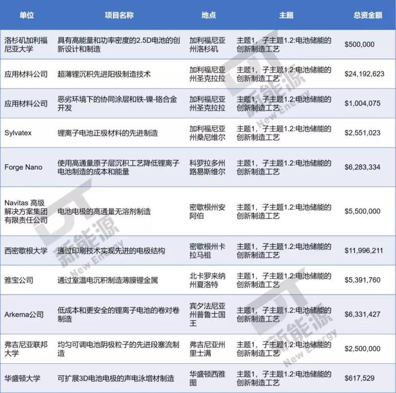 這些項目涵蓋陽極制造工藝、涂層技術、陰極制造工藝、3D打印電池等多個技術領域,負責單位從大學到企業(yè)都有涉及。