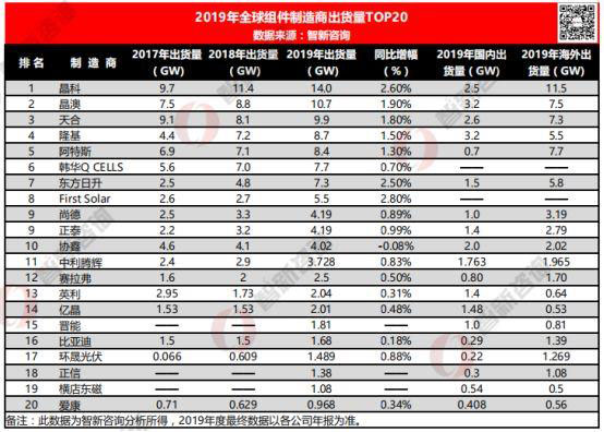 根據(jù)智新咨詢最新發(fā)布的調(diào)研數(shù)據(jù)顯示,2019年全球組件制造商總出貨量方面,晶科依靠海外市場發(fā)力,獲得了更多的銷量,以14GW的總出貨成績成功再次登頂。