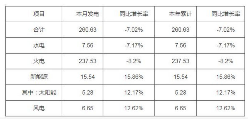 (一)發(fā)電量情況。1月份當(dāng)月,全省發(fā)電量260.63億千瓦時(shí),同比減少7.02%。其中水電7.56億千瓦時(shí),同比減少7.17%;火電237.53億千瓦時(shí),同比減少8.2%;新能源15.54億千瓦時(shí),同比增長(zhǎng)15.86%。