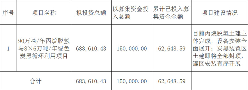據(jù)了解,90 萬噸/年丙烷脫氫與 8×6 萬噸/年綠色炭黑循環(huán)利用項(xiàng)目投資總額為68.36億元,其中15億來源于募集資金(公司 2019 年 10 月通過公開發(fā)行 1500 萬張可轉(zhuǎn)換公司債券,募集所得)。其余部分由公司自籌。