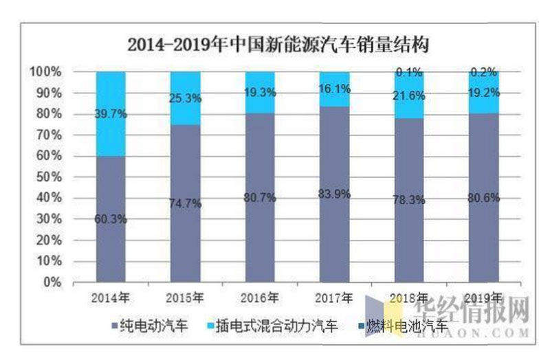 從動力結(jié)構(gòu)來看,純電動汽車是拉動新能源汽車發(fā)展的主要動力,2019年純電動汽車銷售量約為97.2萬輛,占新能源汽車銷售總量的80.6%;插電式混合動力汽車銷量約為23.2萬輛,占比19.2%;燃料電池汽車銷量2737輛,占比0.2%。