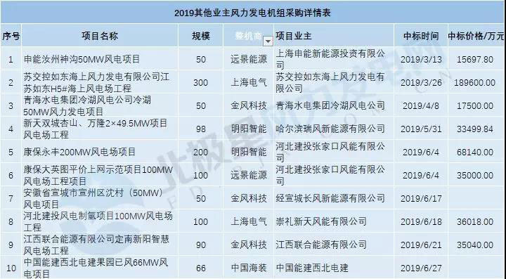 其中,金風(fēng)科技中標(biāo)6個風(fēng)電項目,中標(biāo)項目規(guī)模615MW,中標(biāo)金額為263115.98萬元;遠(yuǎn)景能源中標(biāo)10個風(fēng)電項目,中標(biāo)項目規(guī)模706.9MW,中標(biāo)金額為260706.85萬元;明陽智能中標(biāo)4個風(fēng)電項目,中標(biāo)項目規(guī)模462.6MW,中標(biāo)金額為125939.84萬元;上海電氣中標(biāo)5個風(fēng)電項目,中標(biāo)項目規(guī)模749.5MW,中標(biāo)金額為667981.5萬元;中國海裝中標(biāo)4個風(fēng)電項目,中標(biāo)項目規(guī)模516MW,中標(biāo)金額為166375萬元;湘電風(fēng)能中標(biāo)4個風(fēng)電項目,中標(biāo)項目規(guī)模235MW,中標(biāo)金額為107432萬元;中車株洲所中標(biāo)1個風(fēng)電項目,中標(biāo)項目規(guī)模15MW,中標(biāo)金額為6106.625萬元;維斯塔斯中標(biāo)1個風(fēng)電項目,中標(biāo)項目規(guī)模200MW,中標(biāo)金額為79652.16萬元;東方風(fēng)電中標(biāo)1個風(fēng)電項目,中標(biāo)項目規(guī)模50MW;運(yùn)達(dá)風(fēng)電中標(biāo)3個風(fēng)電項目,中標(biāo)項目規(guī)模280MW,中標(biāo)金額為98000萬元;GE中標(biāo)3個風(fēng)電項目,中標(biāo)項目規(guī)模100MW,中標(biāo)金額為34914.5萬元;山東中車中標(biāo)個風(fēng)電項目,中標(biāo)項目規(guī)模100MW,中標(biāo)金額為37406.26萬元。以下為其他風(fēng)電業(yè)主部分項目采購情況表。