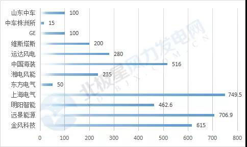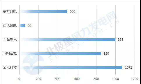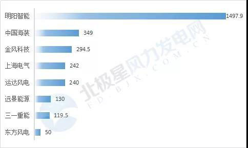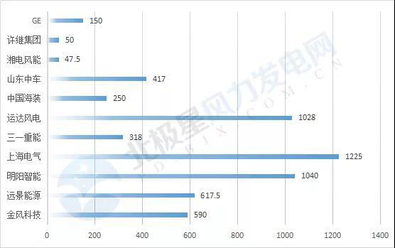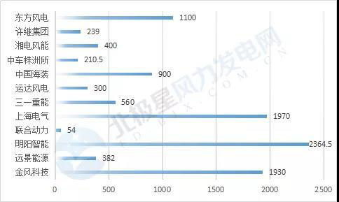 其中,金風(fēng)科技中標(biāo)3個風(fēng)電項目,中標(biāo)項目規(guī)模590MW,中標(biāo)總訂單金額為413442.67 萬元;遠(yuǎn)景能源中標(biāo)7個風(fēng)電項目,中標(biāo)項目規(guī)模617.5MW,中標(biāo)總訂單金額為277612.20 萬元;明陽智能中標(biāo)6個風(fēng)電項目,中標(biāo)項目規(guī)模1040MW,中標(biāo)總訂單金額為520262.61 萬元;上海電氣中標(biāo)4個風(fēng)電項目,中標(biāo)項目規(guī)模1225MW,中標(biāo)總訂單金額為782653.14 萬元;運(yùn)達(dá)風(fēng)電中標(biāo)7個風(fēng)電項目,中標(biāo)項目規(guī)模1028MW,中標(biāo)總訂單金額為404246.01 萬元;中國海裝中標(biāo)5個風(fēng)電項目,中標(biāo)項目規(guī)模250MW,中標(biāo)總訂單金額為132226.53 萬元;三一重能中標(biāo)7個風(fēng)電項目,中標(biāo)項目規(guī)模318MW,中標(biāo)總訂單金額為141240.00萬元;山東中車中標(biāo)5個風(fēng)電項目,中標(biāo)項目規(guī)模417MW,中標(biāo)總訂單金額為195690.66萬元;許繼風(fēng)電中標(biāo)1個風(fēng)電項目,中標(biāo)項目規(guī)模50MW,中標(biāo)總訂單金額為23679.13 萬元;湘電風(fēng)能中標(biāo)47.5個風(fēng)電項目,中標(biāo)項目規(guī)模18920.56 MW,中標(biāo)總訂單金額為195690.66萬元;GE中標(biāo)1個風(fēng)電項目,中標(biāo)項目規(guī)模150MW,中標(biāo)總訂單金額為60763.40 萬元;