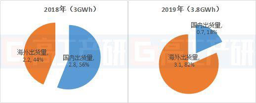 2018-2019年中國儲(chǔ)能鋰電池出貨量(分國內(nèi)和海外)