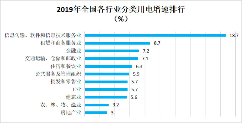 由上圖可見,2019年全國信息傳輸、軟件和信息技術(shù)服務(wù)業(yè)的用電增速最高,達18.7%,而房地產(chǎn)業(yè)用電增速最低,僅3%。