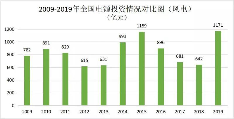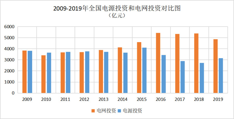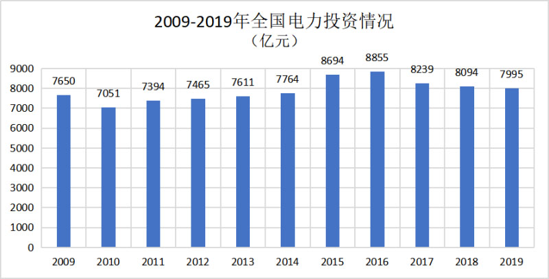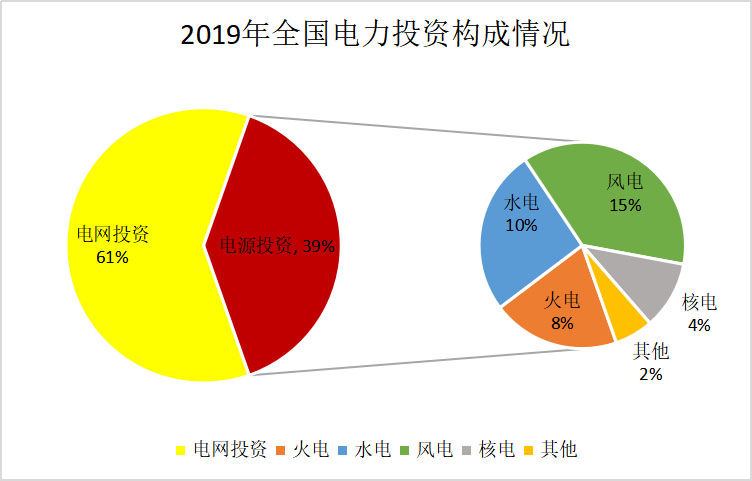2019年,全國(guó)電力投資累計(jì)7995億元,同比下降2.0%。其中,電源投資3139億元(其中:水電814億元、火電630億元、核電335億元、風(fēng)電1171億元);電網(wǎng)投資4856億元。