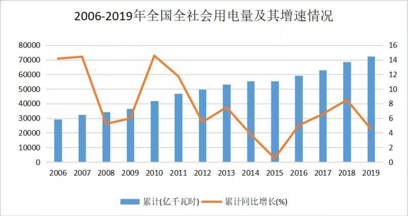 2019年,全國(guó)全社會(huì)用電量累計(jì)72255億千瓦時(shí),同比增長(zhǎng)4.5%。
