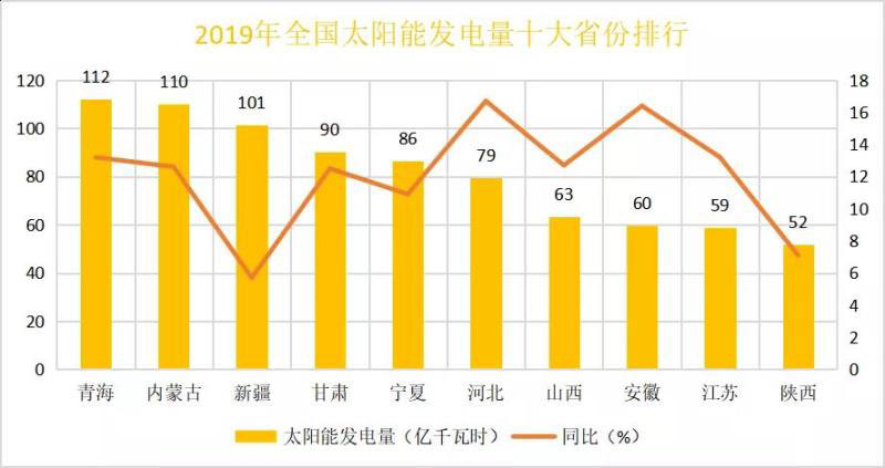 2019年,全國(guó)太陽(yáng)能發(fā)電量排行前十的省份分別是:青海112億千瓦時(shí)、內(nèi)蒙古110億千瓦時(shí)、新疆101億千瓦時(shí)、甘肅90億千瓦時(shí)、寧夏86億千瓦時(shí)、河北79億千瓦時(shí)、山西63億千瓦時(shí)、安徽60億千瓦時(shí)、江蘇59億千瓦時(shí)、陜西52億千瓦時(shí)。