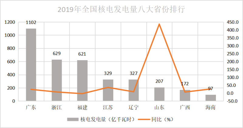 2019年,全國(guó)核電發(fā)電八大省份的發(fā)電量分別是:廣東1102億千瓦時(shí)、浙江629億千瓦時(shí)、福建621億千瓦時(shí)、江蘇329億千瓦時(shí)、遼寧327億千瓦時(shí)、山東207億千瓦時(shí)、廣西172千瓦時(shí)、海南97億千瓦時(shí)。