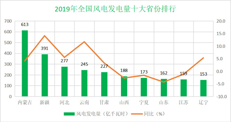 2019年,全國(guó)風(fēng)電發(fā)電量排行前十的省份分別是:內(nèi)蒙古612.8億千瓦時(shí)、新疆391.4億千瓦時(shí)、河北277.3億千瓦時(shí)、云南245.3億千瓦時(shí)、甘肅226.9億千瓦時(shí)、山西188.1億千瓦時(shí)、寧夏173億千瓦時(shí)、山東162.4億千瓦時(shí)、江蘇158.6億千瓦時(shí)、遼寧153.1億千瓦時(shí)。