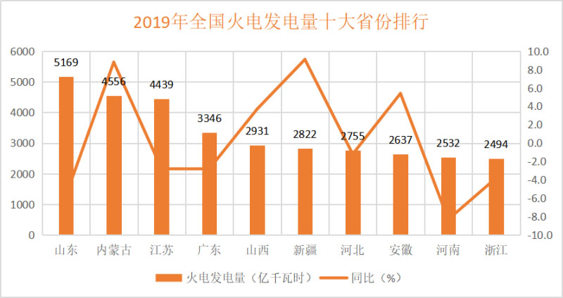 2019年,全國(guó)火電發(fā)電量排行前十的省份分別是:山東5169億千瓦時(shí)、內(nèi)蒙古4556億千瓦時(shí)、江蘇4439億千瓦時(shí)、廣東3346億千瓦時(shí)、山西2931億千瓦時(shí)、新疆2822億千瓦時(shí)、河北2755億千瓦時(shí)、安徽2637億千瓦時(shí)、河南2532億千瓦時(shí)、浙江2494億千瓦時(shí)。
