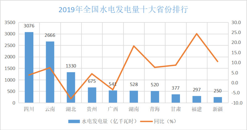 2019年,全國(guó)水電發(fā)電量排行前十的省份分別是:四川3076億千瓦時(shí)、云南2666億千瓦時(shí)、湖北1330億千瓦時(shí)、貴州675億千瓦時(shí)、廣西541億千瓦時(shí)、湖南528億千瓦時(shí)、青海520億千瓦時(shí)、甘肅377億千瓦時(shí)、福建297億千瓦時(shí)、新疆250億千瓦時(shí)。