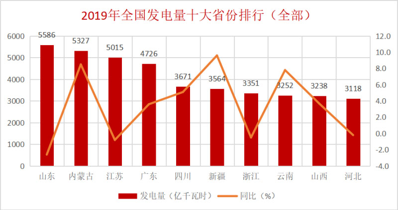 2019年,全國(guó)發(fā)電量排行前十的省份分別是:山東5586億千瓦時(shí)、內(nèi)蒙古5327億千瓦時(shí)、江蘇5015億千瓦時(shí)、廣東4726億千瓦時(shí)、四川3671億千瓦時(shí)、新疆3564億千瓦時(shí)、浙江3351億千瓦時(shí)、云南3252億千瓦時(shí)、山西3238億千瓦時(shí)、河北3118億千瓦時(shí)。