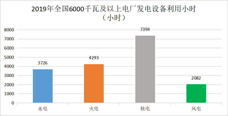 2019年,全國(guó)6000千瓦及以上電廠(chǎng)發(fā)電設(shè)備累計(jì)平均利用小時(shí)為3825小時(shí)。其中,水電3726小時(shí)、火電4293小時(shí)、核電7394小時(shí)、風(fēng)電2082小時(shí)。