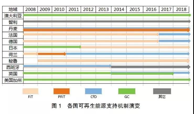雖然各國采取的激勵機(jī)制存在不同,但仍存在一些普遍性規(guī)律:一是所有機(jī)制在某種程度上都能有效促使新容量建成,但前提是機(jī)制需提供足夠高的支持力度,保障投資者收益;二是部分國家使用固定上網(wǎng)電價作為早期支持機(jī)制,其概念和設(shè)計(jì)簡單,回報(bào)穩(wěn)定,發(fā)電商面臨的風(fēng)險最低,隨著技術(shù)的逐步成熟,支持機(jī)制也隨之變化,但不論如何改變,好的機(jī)制設(shè)計(jì)確保了新、舊機(jī)制之間的延續(xù)性,并且新機(jī)制不追溯存量電站;三是隨著可再生能源比重越來越高,政府財(cái)政補(bǔ)貼的壓力越來越大,越來越多的國家轉(zhuǎn)向差價合約機(jī)制。四是政府沒有明確的支持政策和配套政策,或者政策大起大落,都將導(dǎo)致可再生能源發(fā)展受阻。如圖1所示。