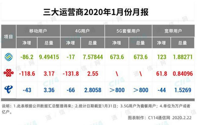 2月24日消息(特約作者 杜建民)雖然尚未全面復(fù)工,但是三大運(yùn)營商都如期公布了2020開年的經(jīng)營數(shù)據(jù)。除了中國聯(lián)通告別持續(xù)多個(gè)月份的用戶“雙降”,中國電信開啟連續(xù)的固網(wǎng)寬帶負(fù)增長之外,其他的情況與大家預(yù)期的基本相符。