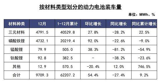 2019年,我國動力電池裝車量累計62.2GWh,同比累計增長9.2%。其中,三元電池裝車量累計40.5GWh,占總裝車量65.2%,同比累計增長22.5%;磷酸鐵鋰電池裝車量累計20.2GWh,占總裝車量32.5%,同比累計下降9.0%。
