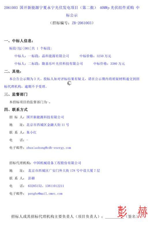 2月24日,國開新能源寧夏永寧光伏發(fā)電項目(第二批) 40MWp光伏組件采購中標結果公示。一標段中標人為晶科能源有限公司(以下簡稱“晶科能源”),二標段中標人為隆基樂葉光伏科技有限公司(以下簡稱“隆基樂葉”)。