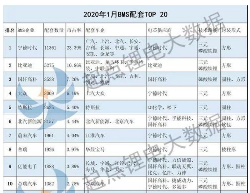 2020年1月份BMS配套TOP20企業(yè)分別是:寧德時代/比亞迪/國軒高科/大眾/特斯拉/北汽新能源/蔚來汽車/普瑞/億能電子/奇瑞汽車/電裝/科易新動力/法可賽/東軟睿馳/孚能科技/宏景電子/上海捷能/威睿電動/河南速達(dá)/威馬汽車。具體如下圖所示: