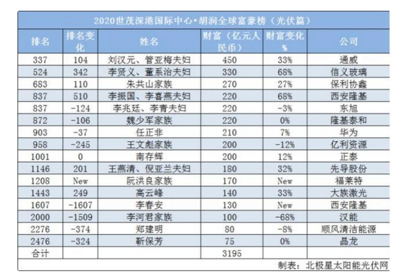 作為全球能源轉(zhuǎn)型的朝陽產(chǎn)業(yè),光伏產(chǎn)業(yè)財富值也迅速飆升,據(jù)北極星太陽能光伏網(wǎng)不完全統(tǒng)計,光伏領(lǐng)域有16家企業(yè)喜提上榜,財富累積3195億元人民幣,具體名單見下表。