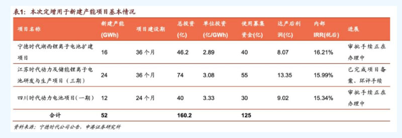 三項新建鋰電池項目合計使用本次募集資金125億元,占比62.5%,共計新增產(chǎn)能52GWh,預(yù)計將于2022~2023年建成投產(chǎn)。