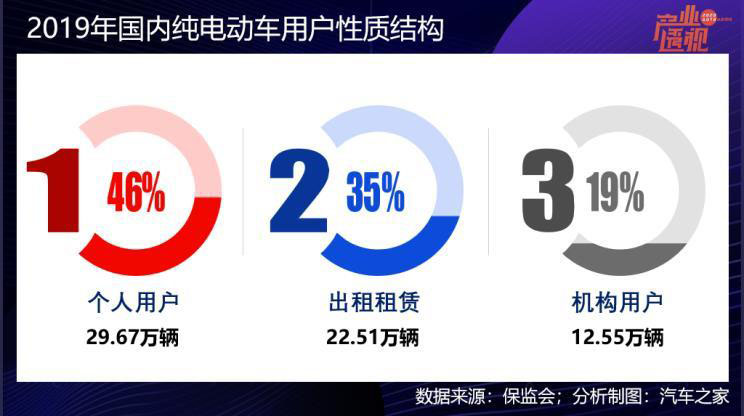 交強險數據顯示,2019年國內純電動汽車的個人用戶比例占46%,出租租賃占比35%。個人用戶里也不排除個人購買但是用于跑網約車的,最樂觀估計,個人用戶約有四成的購買比例,而北京、上海這兩大限購限行城市是個人購買最多的地區(qū)。
