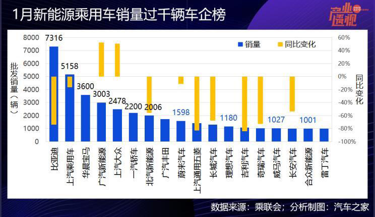 1月僅40家車企有新能源汽車批發(fā),銷量超過1000輛的車企只有18家,且無一過萬,超過5000輛的只有區(qū)區(qū)兩家。最高的是比亞迪,但是7316輛的銷量同比大跌了74%,“老牌”新能源車企可以說是哀鴻一片——北汽新能源批發(fā)銷售2006輛,同比大跌56%,上汽通用五菱跌去83%,吉利汽車跌84%,奇瑞汽車跌73%,長安汽車跌53%。上汽乘用車月銷量排第二,同比跌去16%,算是表現很好的了。