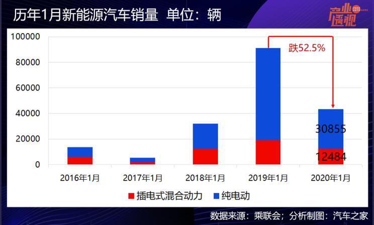 乘聯(lián)會數據顯示,2020年1月國內新能源乘用車批發(fā)銷售43339輛,同比大降52.5%,其中純電動車批發(fā)30855輛,同比降57.3%,插電式混合動力車批發(fā)12484輛,同比降34.4%。1月份新能源乘用車批發(fā)銷售滲透率也跌到了2.69%。