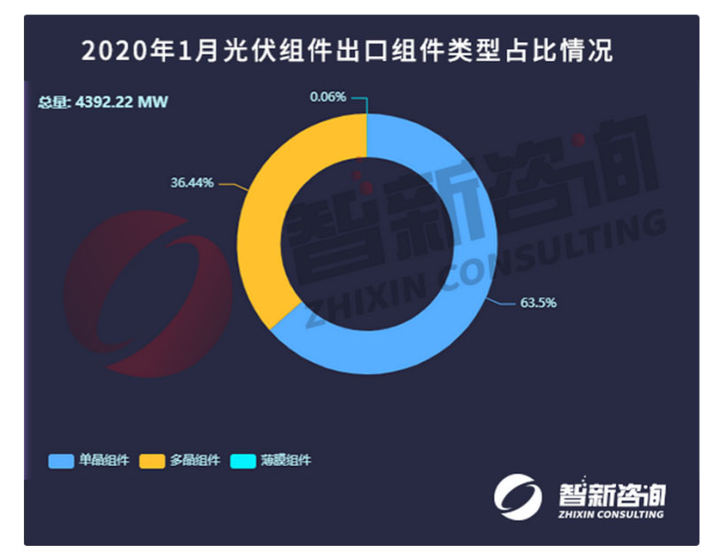 組件整體出口類型方面,單晶占比63.5%,多晶占比36.41%,薄膜占比0.06%。與2019年全年數(shù)據(jù)相比,單晶占比提高了24%。智新咨詢認(rèn)為,未來一段時間單晶硅電池組件將成為行業(yè)的技術(shù)發(fā)展趨勢,多家行業(yè)巨頭紛紛順應(yīng)單晶和多晶的發(fā)展趨勢,積極布局單晶產(chǎn)能。如天合光能,目前的單晶產(chǎn)能占比約60%,預(yù)計到2020年底超過75%,單晶將是主要發(fā)展方向。
