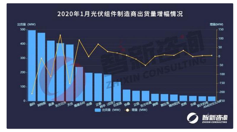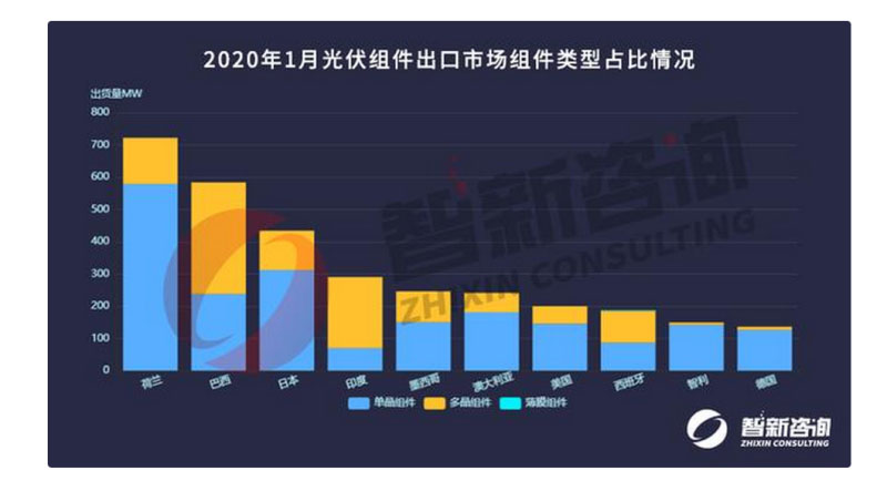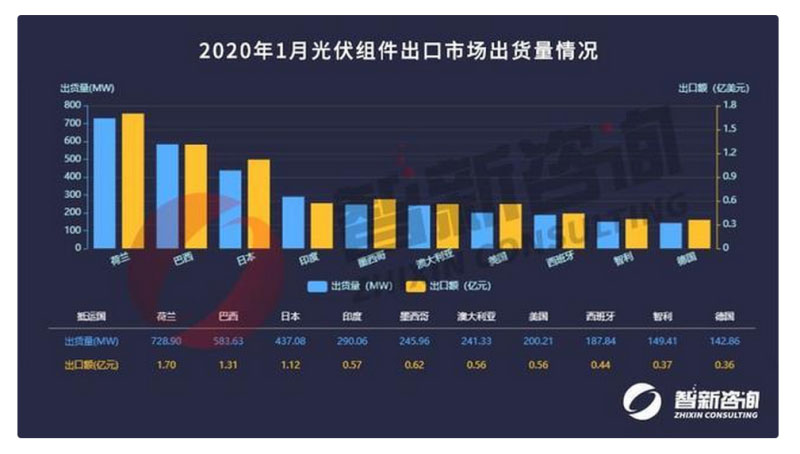 本月出口數(shù)據(jù)暫未受疫情影響,基本與上月持平,出貨量小幅下降3%。智新咨詢認(rèn)為,疫情對出口方面的影響或從2月起開始顯現(xiàn),一直持續(xù)到5月。疫情給組件出口企業(yè)帶來最直接的影響就是生產(chǎn)。因疫情延遲復(fù)工,會在一定程度上影響企業(yè)的正常生產(chǎn),即使企業(yè)復(fù)工,返回工作崗位的工人也需要進(jìn)行隔離,影響企業(yè)的生產(chǎn)效率。