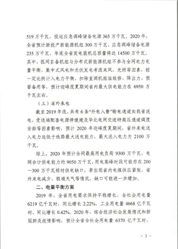 2020 年,受新冠肺炎疫情影響,山東省內部分新建機組和跨省區(qū)輸電通道配套電源建設投產延后,新增供電能力將明顯低于原規(guī)劃安排,山東省夏季電力供需形勢總體偏緊,用電高峰期存在200 -300萬千瓦的短時供電缺口。這是昨日(2月28日)山東省能源局印發(fā)的《2020年全省電力電量平衡方案》(以下簡稱《方案》)通知中的主要內容之一。