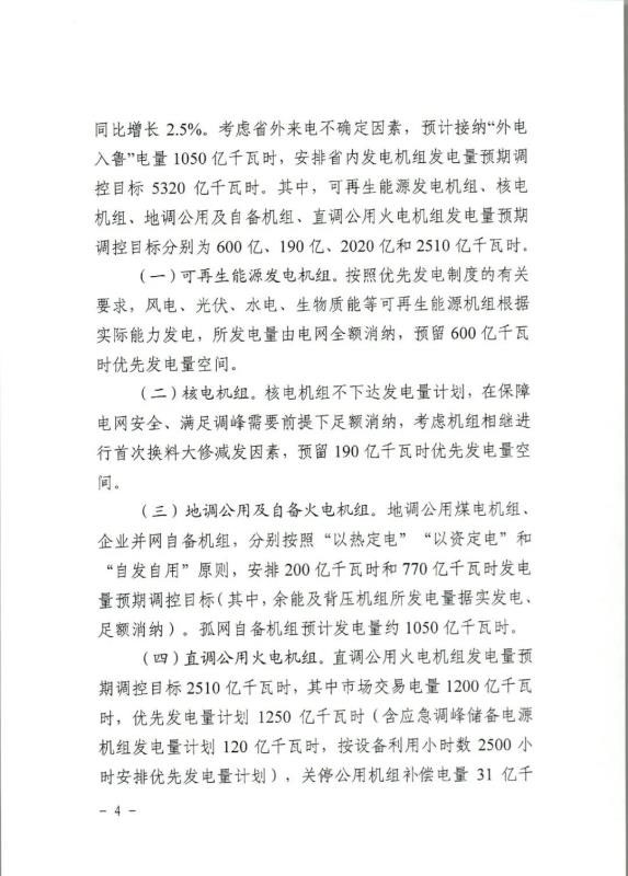 同比增長 2.5%??紤]省外來電不確定因素,預計接納“外電入魯”電量1050億千瓦時,安排省內發(fā)電機組發(fā)電量預期調控目標5320億千瓦時。其中,可再生能源發(fā)電機組 、核電機組、地調公用及自備機組、直調公用火電機組發(fā)電量預期調控目標分別為 600億、190億、2020億和 2510億千瓦時。