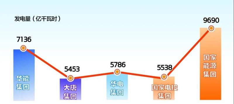 國(guó)家能源集團(tuán)發(fā)電量9690億千瓦時(shí),同比增長(zhǎng)1.65%,處在領(lǐng)跑位置。華能集團(tuán)完成發(fā)電量(國(guó)內(nèi))7136億千瓦時(shí),同比增長(zhǎng)1.56%。華電集團(tuán)完成實(shí)發(fā)電量5786億千瓦時(shí),同比增長(zhǎng)4.09%。國(guó)家電投集團(tuán)全力以赴增產(chǎn)增收,全年發(fā)電量5538億千瓦時(shí),同比增長(zhǎng)11.2%。大唐集團(tuán)完成發(fā)電量5453億千瓦時(shí)。