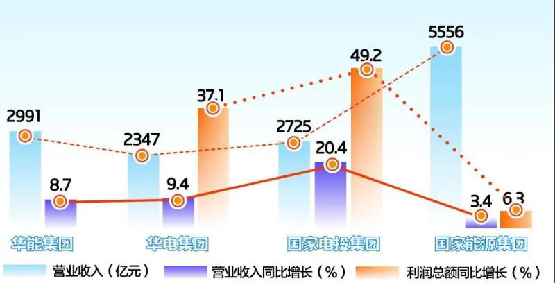 2019年,煤炭市場(chǎng)供需有所緩和、減費(fèi)降稅力度加大、清潔能源進(jìn)一步緩解、資金市場(chǎng)趨于寬松,發(fā)電企業(yè)營(yíng)業(yè)收入保持增長(zhǎng)態(tài)勢(shì)。國(guó)家能源集團(tuán)全年?duì)I業(yè)收入5556億元,同比增長(zhǎng)3.4%;利潤(rùn)總額同比增長(zhǎng)6.3%。華能集團(tuán)營(yíng)業(yè)收入同比增長(zhǎng)8.7%,為2991億元。國(guó)家電投集團(tuán)全年實(shí)現(xiàn)營(yíng)業(yè)收入2725億元,同比增長(zhǎng)20.4%;利潤(rùn)總額同比增長(zhǎng)49.2%。華電集團(tuán)全年實(shí)現(xiàn)銷售收入2347億元,同比增長(zhǎng)9.4%;利潤(rùn)總額同比增長(zhǎng)37.1%。(大唐集團(tuán)數(shù)據(jù)略)