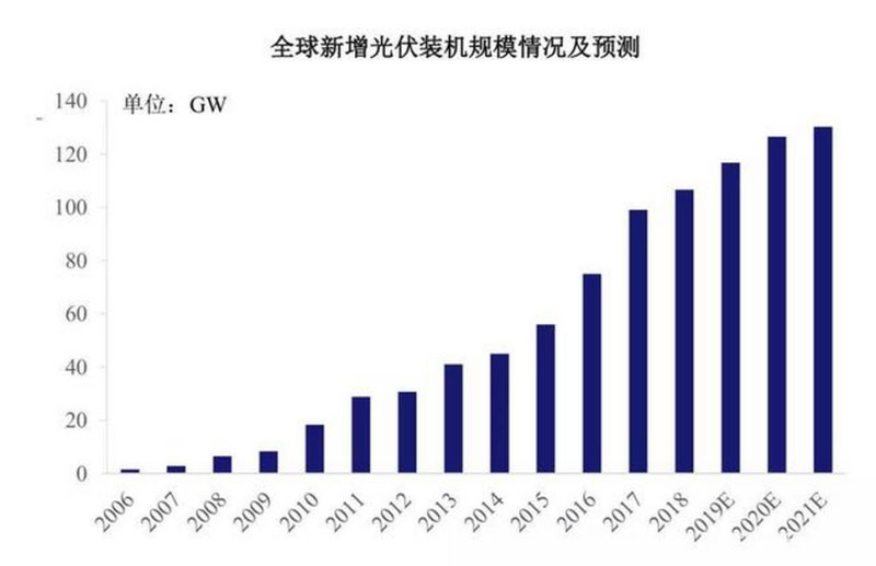根據(jù)彭博新能源財(cái)經(jīng)(BNEF)統(tǒng)計(jì),全球光伏發(fā)電新增裝機(jī)容量從2008年的5.95GW迅速增長(zhǎng)到2018年的106GW,復(fù)合增長(zhǎng)率達(dá)31.32%。而2018年全球所有可再生能源新增裝機(jī)量為171GW,光伏新增裝機(jī)量占可再生能源裝機(jī)量的一半以上,累計(jì)光伏裝機(jī)容量占全球可再生能源的三分之一左右,全球光伏行業(yè)在過去十年呈現(xiàn)出高速增長(zhǎng)態(tài)勢(shì)。