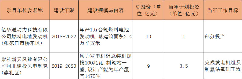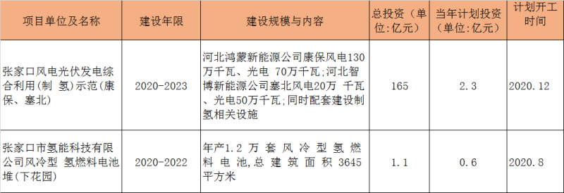 值得一提的是,張家口的氫能產(chǎn)業(yè)還在持續(xù)壯大中。2020年,當(dāng)?shù)赜?個氫能與燃料電池項目被列入《河北省2020年省重點項目計劃》。其中2個是計劃開工項目,另兩個是續(xù)建項目,項目合計投資額達(dá)185.1億元,項目詳情見下表: