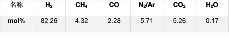 原料氣的組分如圖1-3,壓力為2.2MPa,溫度25℃,是目前化工行業(yè)中常見的原料氣條件,價格約0.9元/Nm3,年滿負(fù)荷運(yùn)行時間8400小時,產(chǎn)品氣要求滿足GB/T 37244-2018《質(zhì)子交換膜燃料電池汽車用燃料 氫氣》,產(chǎn)品氣量為1000Nm3/h(約2143kg/天)。