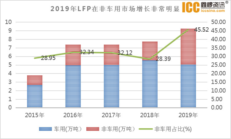 根據(jù)鑫欏資訊統(tǒng)計(jì),2019年磷酸鐵鋰材料產(chǎn)量9.27萬(wàn)噸,其中車用市場(chǎng)消耗僅5萬(wàn)噸,同比少消耗0.5萬(wàn)噸,而非車用市場(chǎng)用量則達(dá)到4.27萬(wàn)噸,份額大幅提升至45.52%,變化明顯。