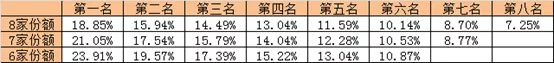 當中標人數(shù)量為7家時,每個中標人對應的中標份額依次為:第一名中標份額為21.05%、第二名中標份額為17.54%、第三名中標份額為15.79%、第四名中標份額為14.04%、第五名中標份額為12.28%、第六名中標份額為10.53%、第七名中標份額為8.77%;