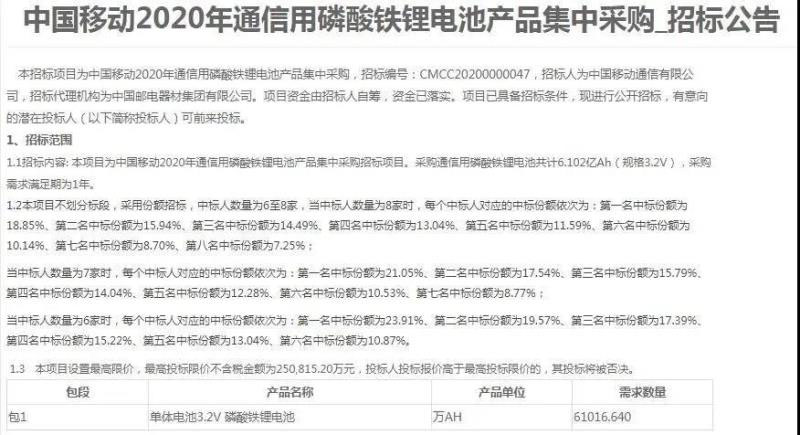 中國移動2020年通信用磷酸鐵鋰電池產(chǎn)品集中采購